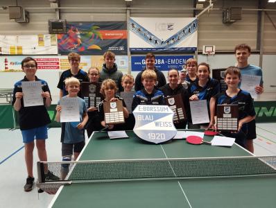 | Mo 15.12.2025: | | Julian Wittkamp holt sich den Titel Jungen 19. | | Borssumer Jugend-Vereinsmeisterschaften 2025. |  Die Borssumer Vereinsmeister-innen und Teilnehmer | Ein Bericht von Fritz: Vereinsmeisterschaften. Bei den diesjährigen Vereinsmeisterschaften, vom Jugendwart Silas Tempel und Helfer perfekt organisiert, gingen 17 Teilnehmer an den Start, wo auch einige Neueinsteiger mit dabei waren. In allen Klassen wurde eine Ranglistenform gewählt, wo jeder gegen jeden antreten musste. Bei den Mädchen gingen nur 3 Teilnehmerinnen an den Start, welche sich dann mit den Jungen messen mussten, dennoch trotzdem aber ihre Pokale in ihren Altersklassen erhielten. Bei den Jungen 19 waren die Teilnehmer aus der Bezirksliga natürlich die Favoriten, wo dann am Ende sich auch Titelverteidiger Max Hoffmann und Julian Wittkamp den Titel im letzten Ranglistenspiel streitig m ... [mehr] | | Di 09.12.2025: | | Borssum‘s 6. Herren holt sich die Herbstmeisterschaft | | Jan-Ole Oeltjen blieb ungeschlagen! |  Die junge Truppe mit Oldie Jan als Betreuer........ | Ein Bericht von Fritz: 2. Kreisklasse FC Loquard 5 - B-W Borssum 6 2:8 Im letzten Hinrundenspiel musste Tabellenführer Borssum bei der Fünften in Loquard antreten. Die Blau-Weissen wurden ihrer Favoritenrolle gerecht, denn sie gewannen gleich beide Eingangsdoppel und bauten diese Führung in den folgenden Einzeln gar auf 7:0 aus. Dann konnte Loquards Tobias Knebel gegen Elias Wittkamp siegreich bleiben u ... [mehr] | | So 07.12.2025: | | Borssumer Jungen15 feiern Herbstmeisterschaft! | | Tom Poets mit 16:0 Bilanz! |  Deike Barth (Loquard) begrüßt die Borssumer vor Spielbeginn. | Ein Bericht von Fritz: Kreisliga Jungen 15